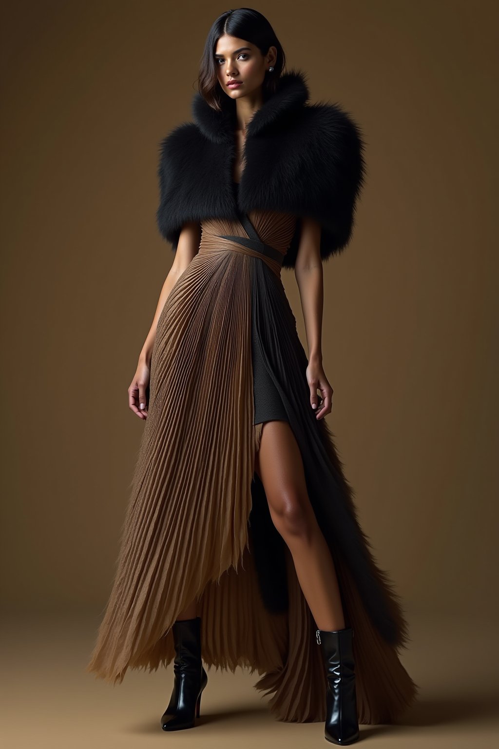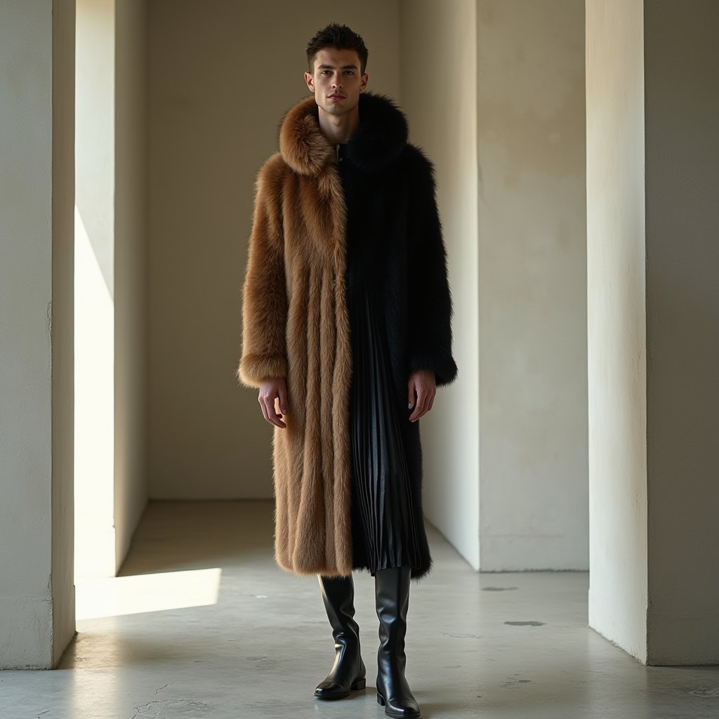 このトレンドの魅力は、奇抜さを抑えた実用性にある。たとえばLoeweの彫刻的ドレスは、硬質なドレープとグラデーションのフェイクファーを用いて、次世代ラグジュアリーを体現。ランウェイではビッグフードが劇的なシルエットを生むが、日常ではこれをウエストコートやオーバーサイズのベストに翻訳可能だ。フェイクファーの柔らかなグラデを、ブラックのトーン・オン・トーンでレイヤードし、テクニカルなレザーパンツと合わせれば、街中で動きのあるムーブメントが際立つ。パリのアスファルトを歩く際、光の反射が素材のコントラストを強調し、静かな存在感を放つだろう。一方、Jean-Paul Gaultierの「女性のマスキュリニティ」探求は、創業者譲りのテーラリングをアップデート。肩パッドの強調をソフトなウール混のブレザーに落とし込み、ハイウエストのテーパードパンツでバランスを取る。ミラノ勢ではPradaやBottega Venetaのquiet luxuryが光り、精密なレイヤリングが秋冬の基調に。ブラックの多様な解釈—マットなベルベットから光沢あるサテンまで—が全編を支配し、エレガンスからソフィスティケートまで幅広い表情を見せた。