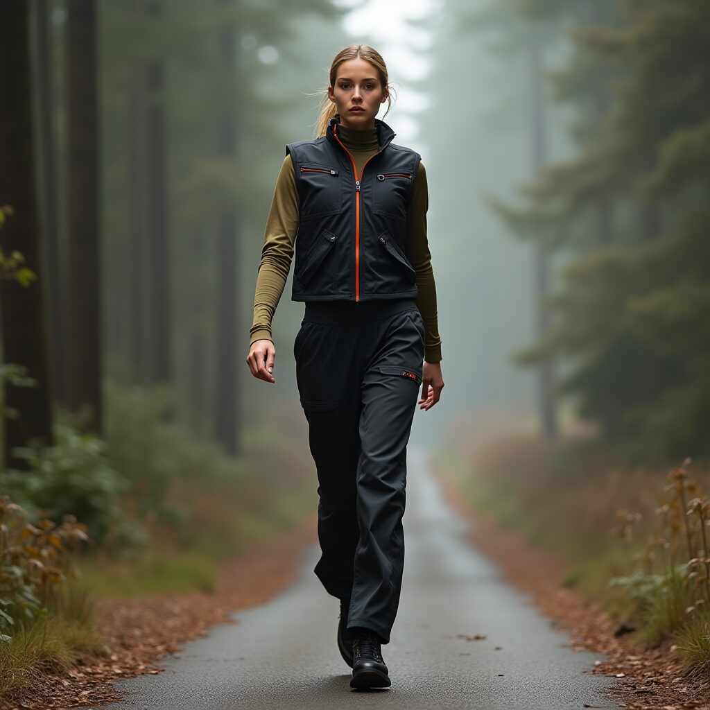 ボトムスは伸縮カーゴパンツが主流で、総柄フリースとのミックスがストリートらしい。提案スタイリングは、ミッドレイヤーとしてPolartec Alphaのヘンリーネックをインナーに、シェルジャケットをオーバーレイ。フィットはオーバーサイズを避け、スリムテーパードパンツでバランスを取る。フェミニン進化版なら、ユーティリティベストにプリーツスカートを合わせ、ベルクロストラップでクライミングディテールを強調。カラーはアースカラー(オリーブ、グリーン)とブロックカラー(ホワイト、オレンジ)の対比で、春夏の軽快さを演出。バックパックやカラビナを加え、レイヤリング構造をファッションの文法に昇華させる。これにより、雨天の通勤から音楽イベントまでシームレスに対応可能だ。