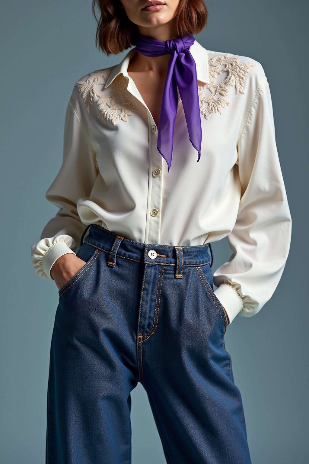 ブルーシャツ、トープカーディガン、モーカパンツ、プラッドスカート、ポンチョ&バンダナのスマートカジュアル。パリ風エフォートレスエレガンスが静かな支持。