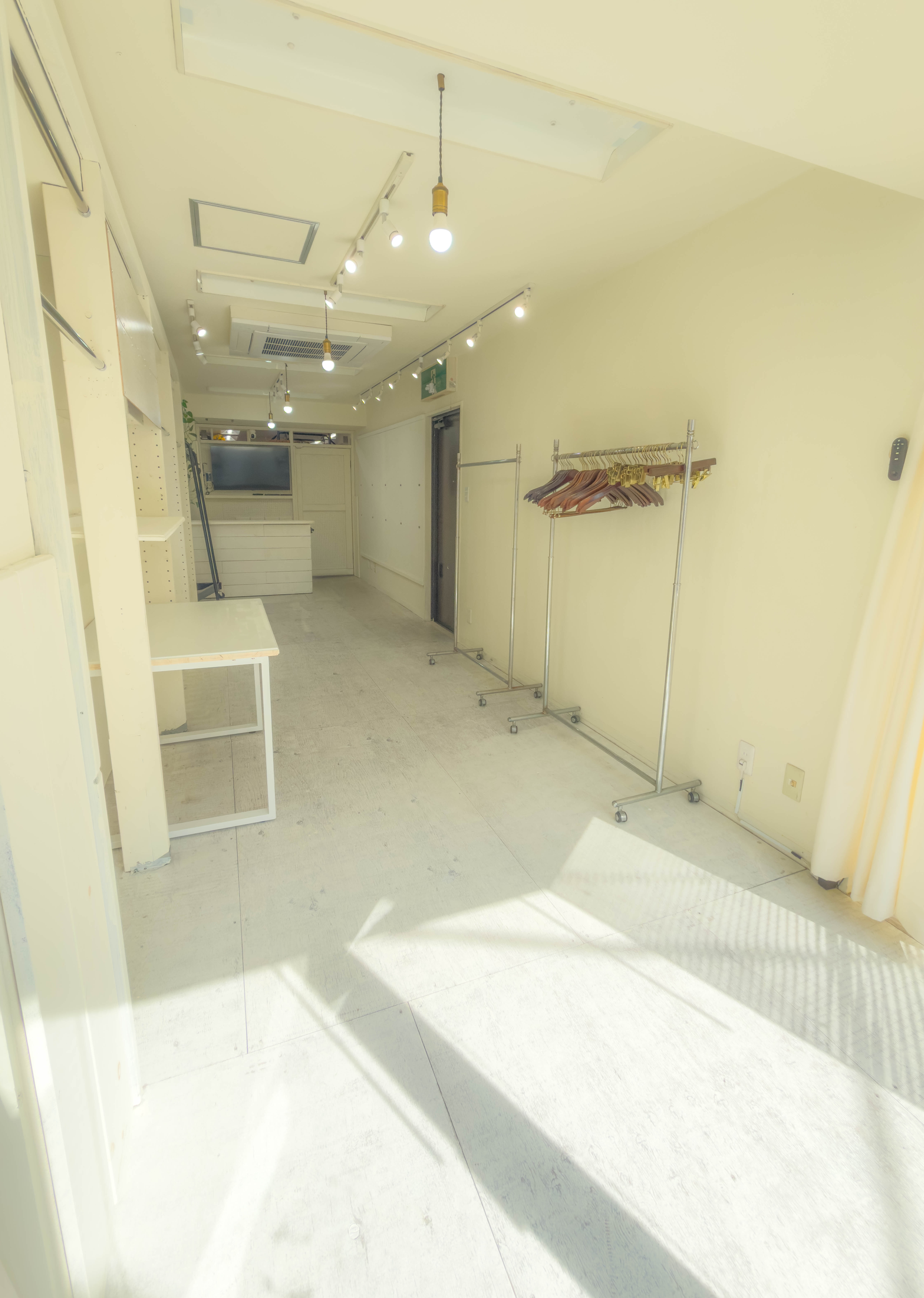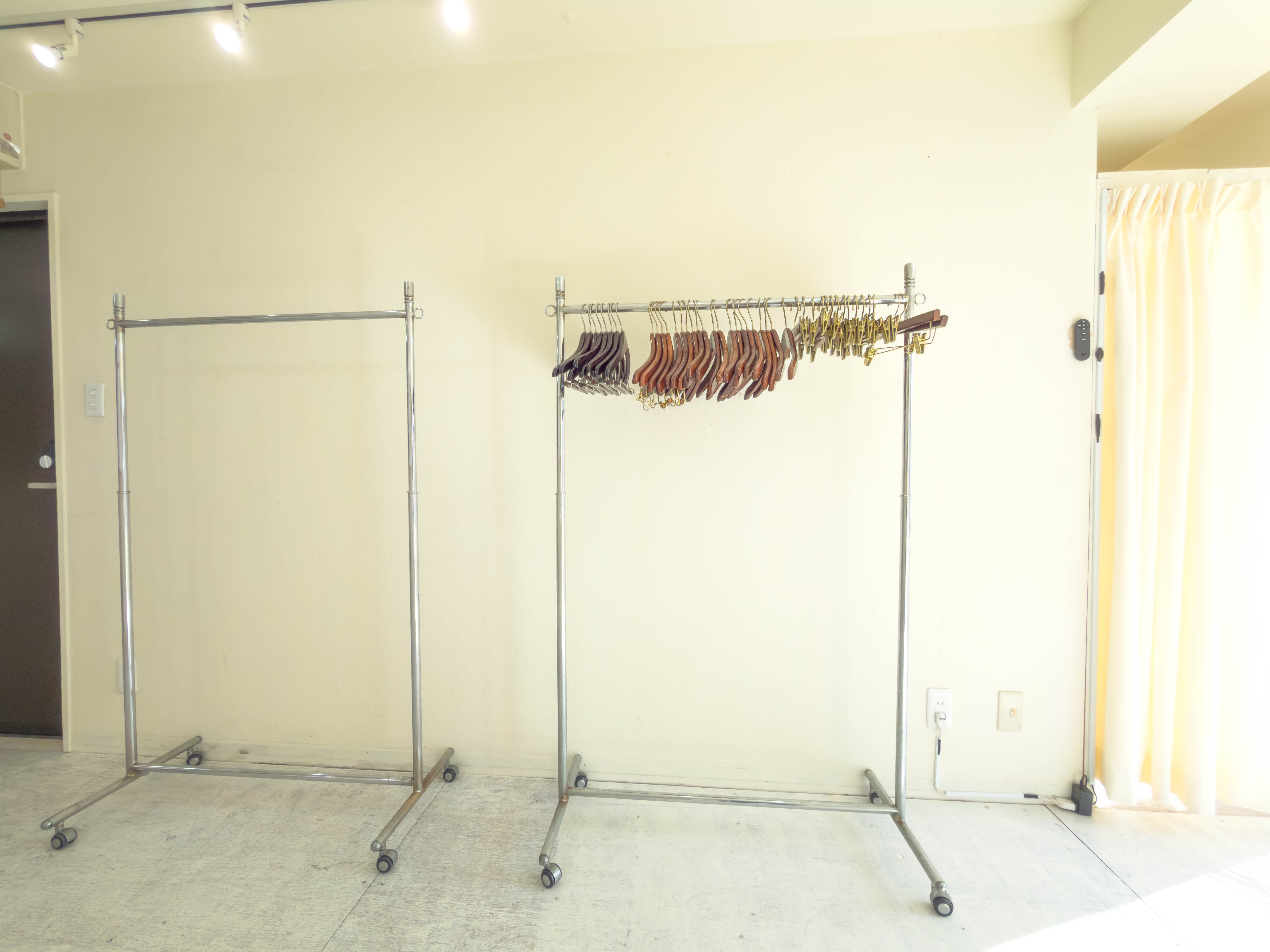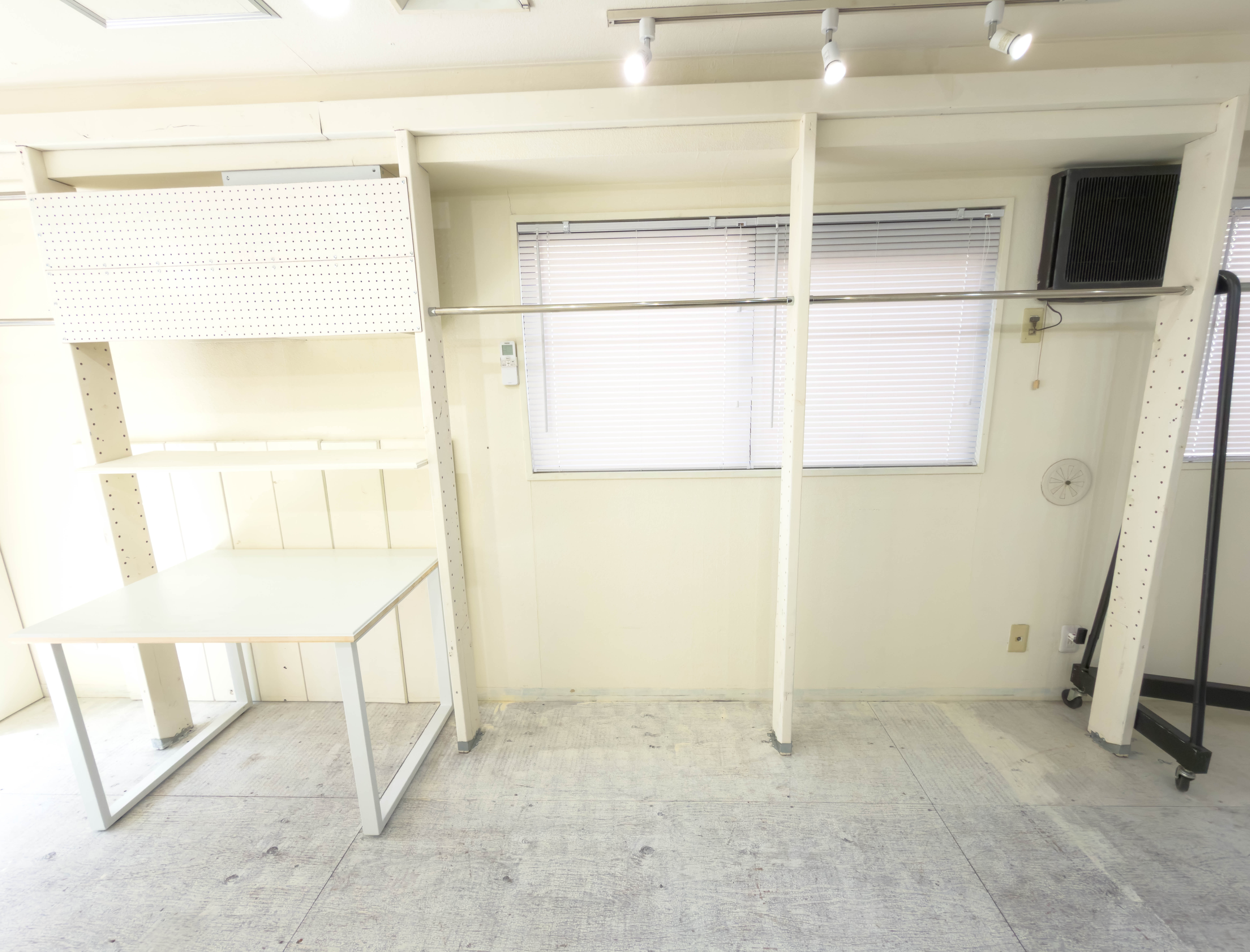 Z型ハンガーラック1台&備え付けハンガーラック2.5台に加え、通常のハンガーラック2台を用意。棚スペースや1000×700のテーブルも完備。