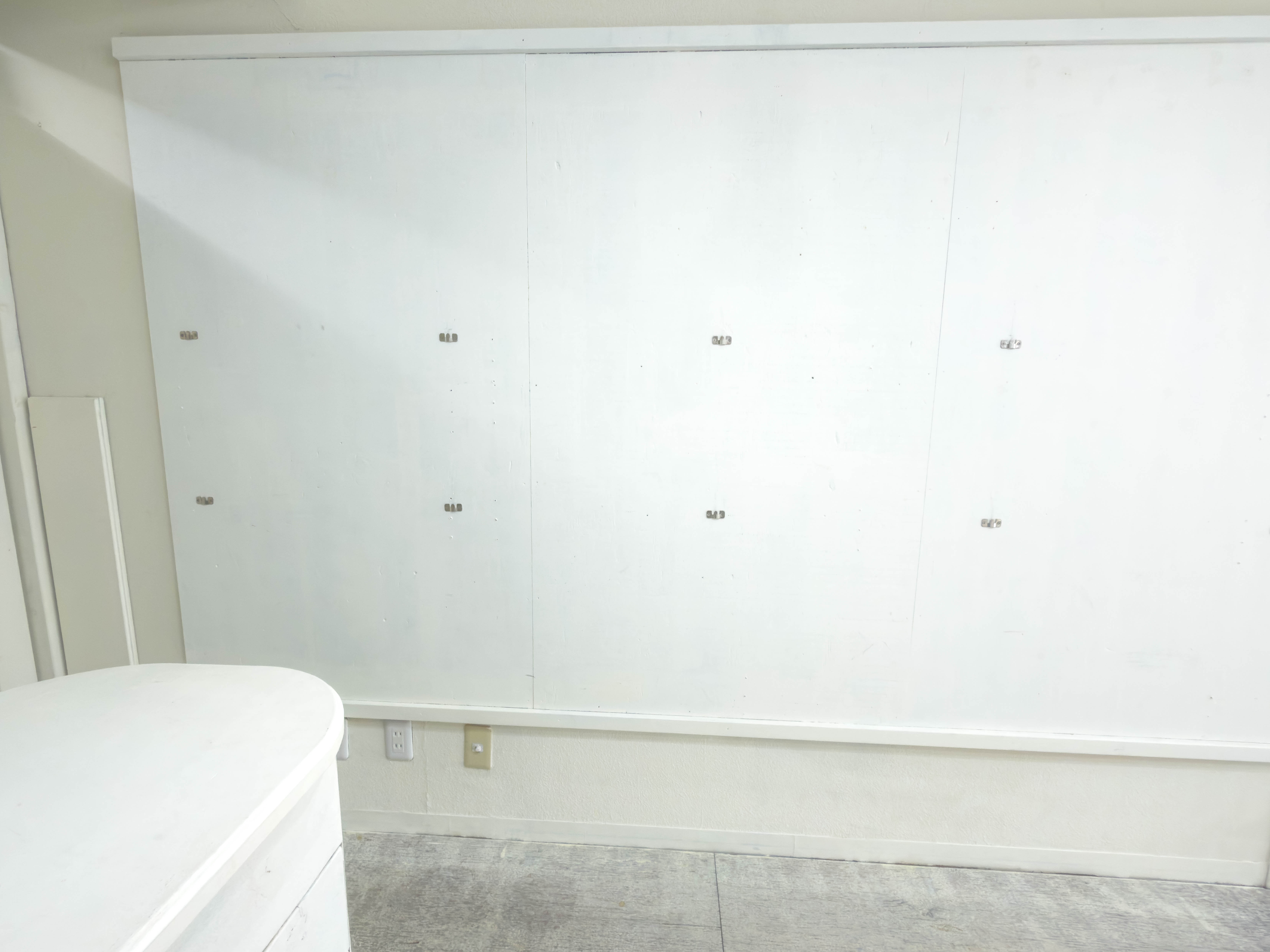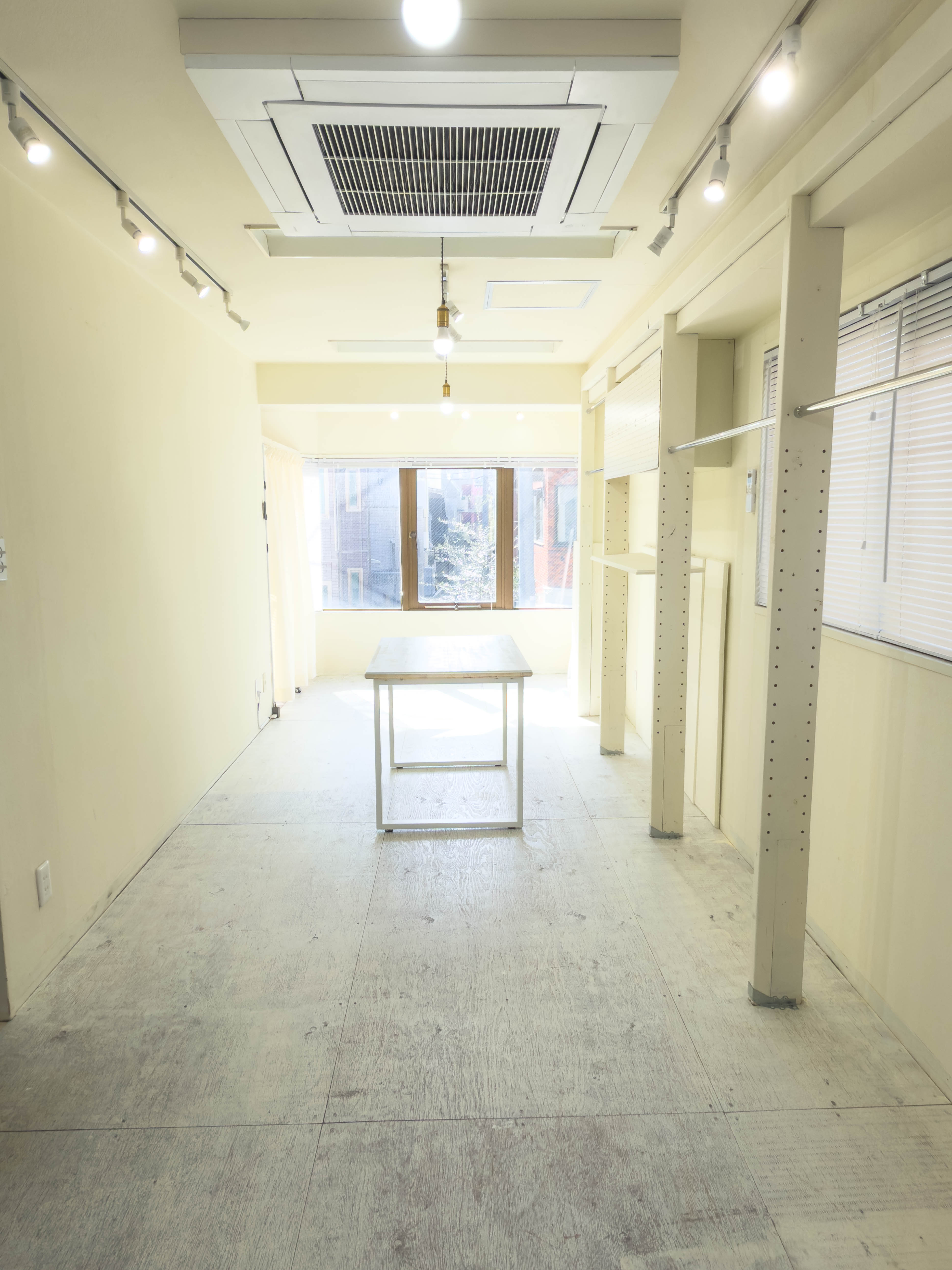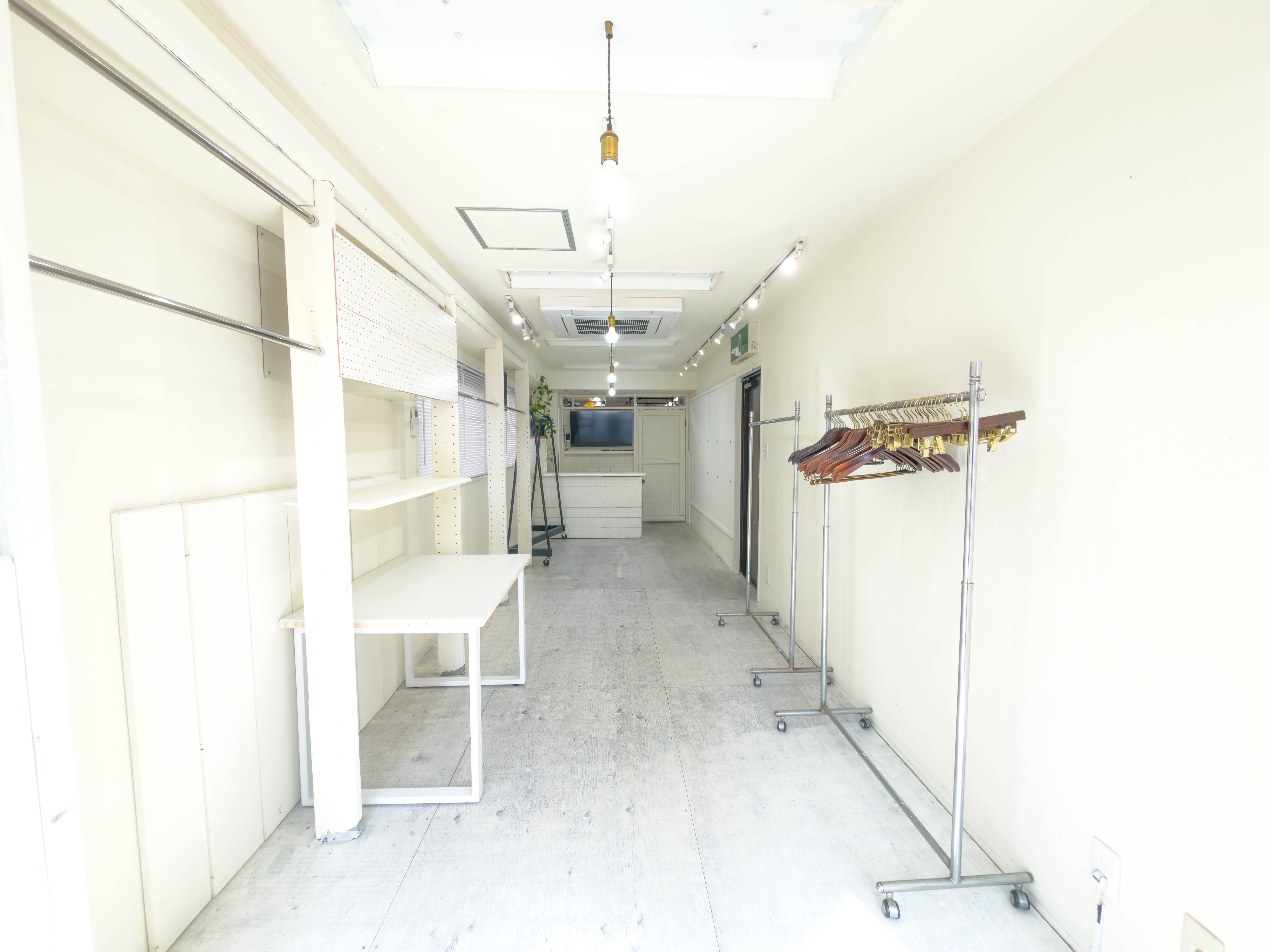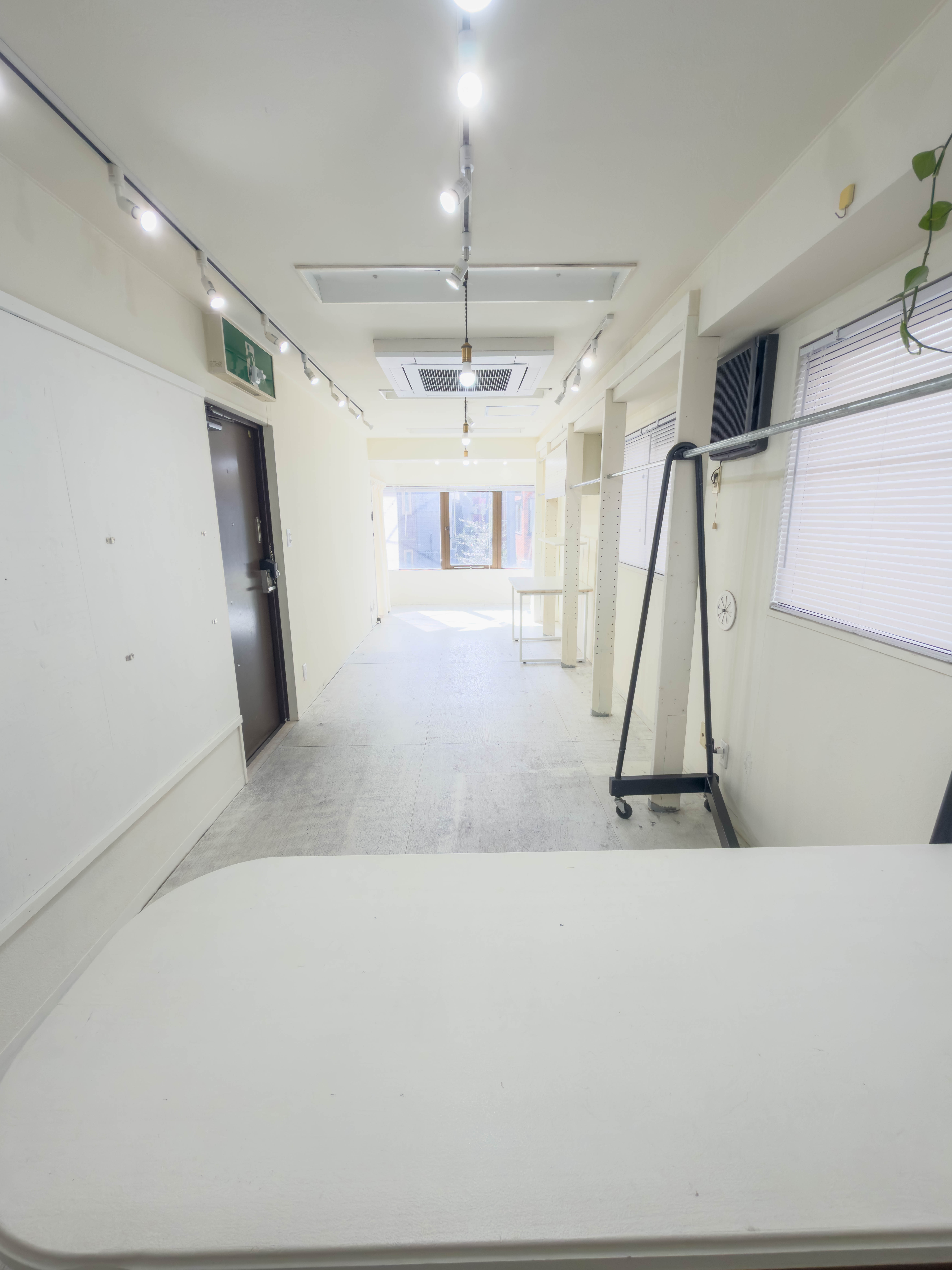 Z型ハンガーラック1台&備え付けハンガーラック2.5台に加え、通常のハンガーラック2台を用意。棚スペースや1000×700のテーブルも完備。
