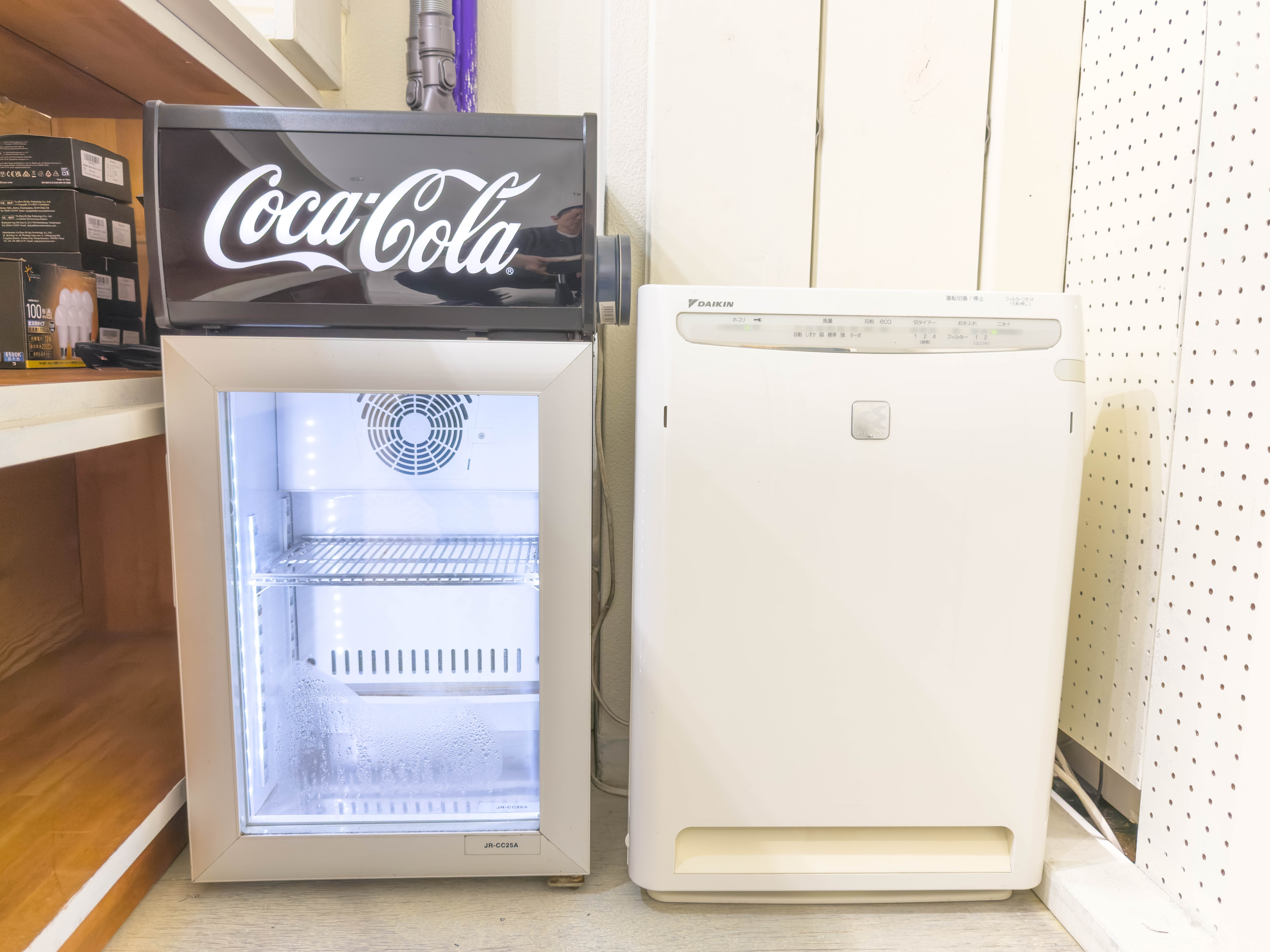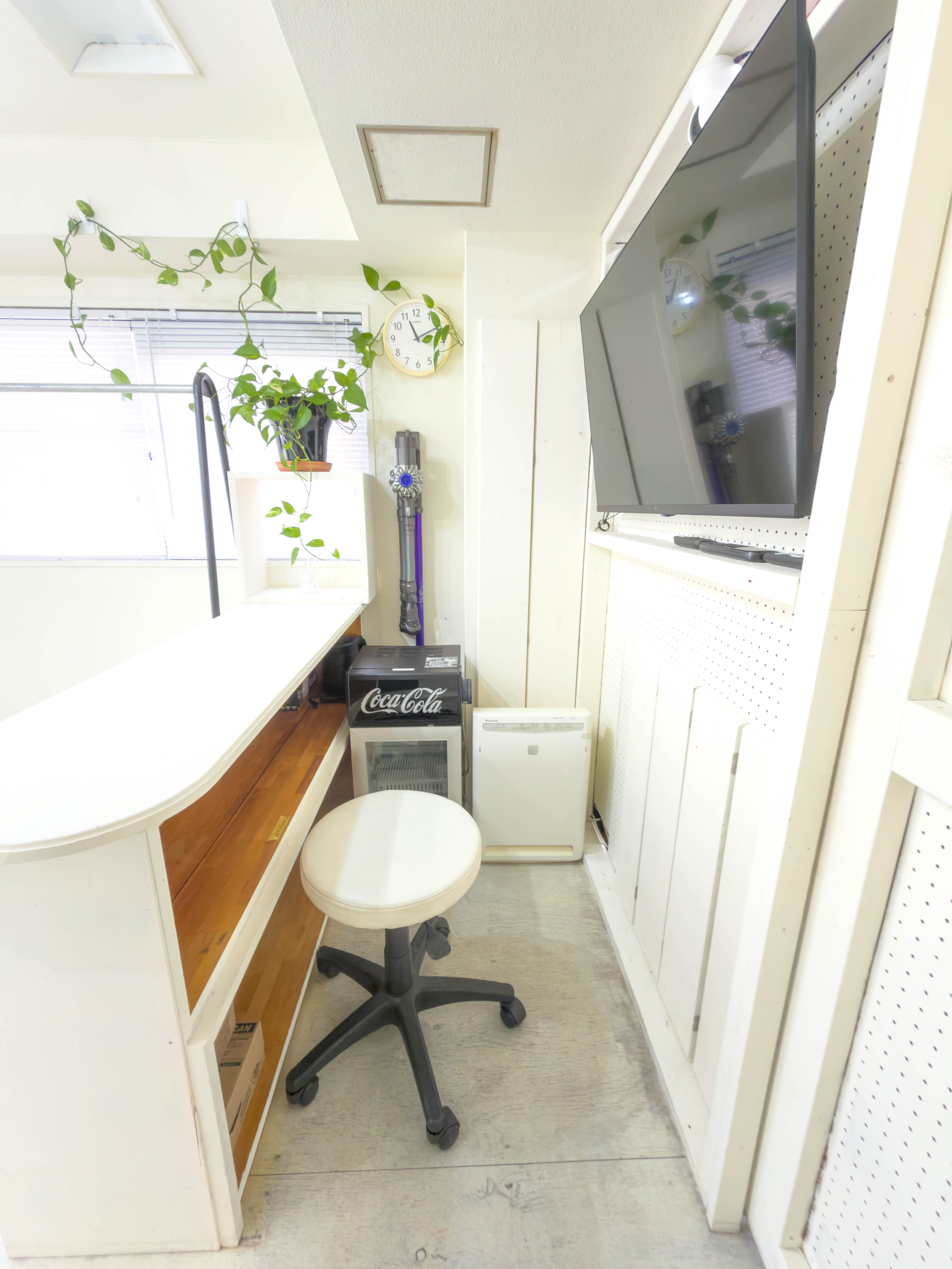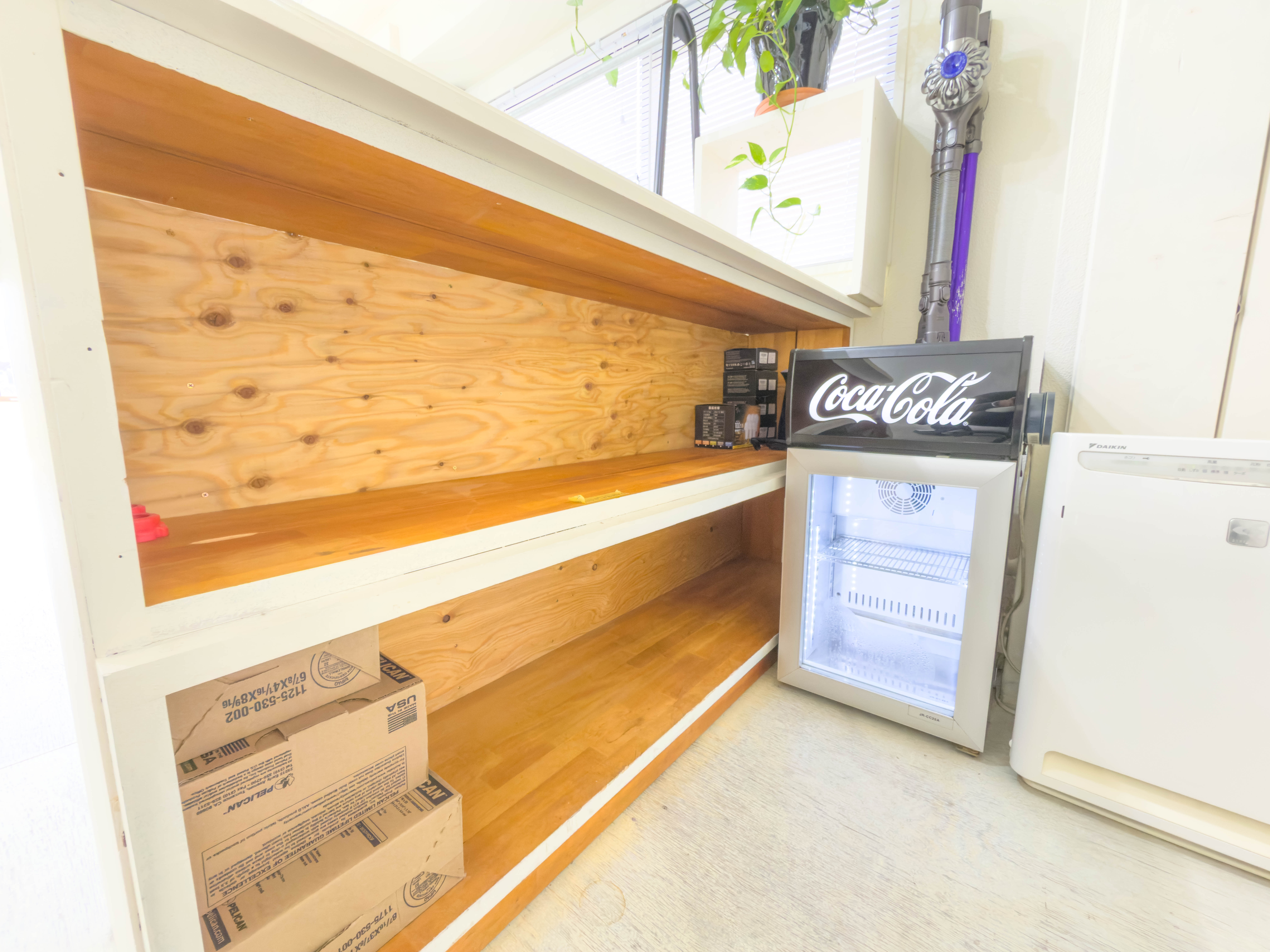 W1600×D450×H870mmのカウンター、空気清浄機、小型冷蔵庫を完備。長時間の展示会も快適に過ごせます。