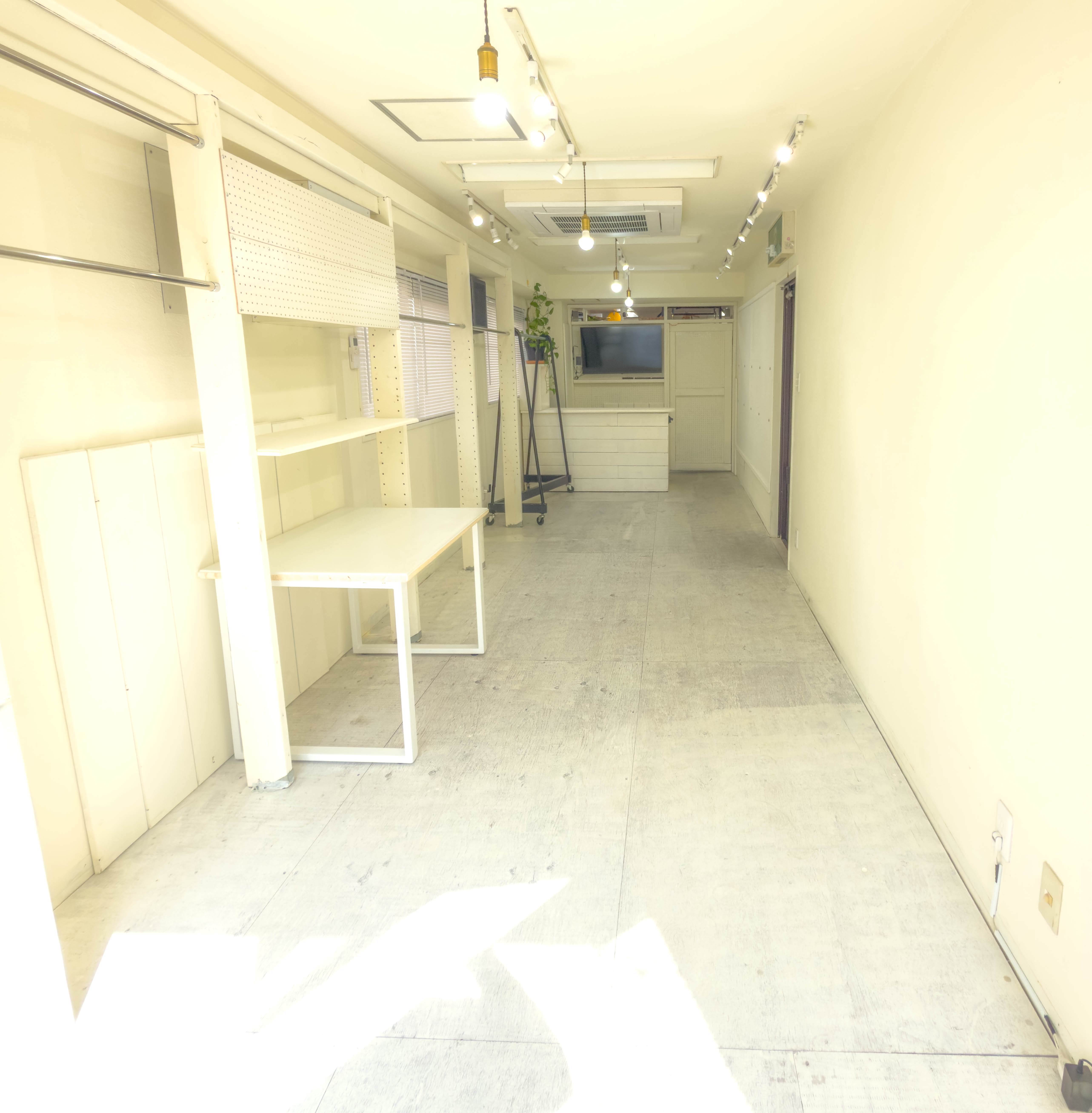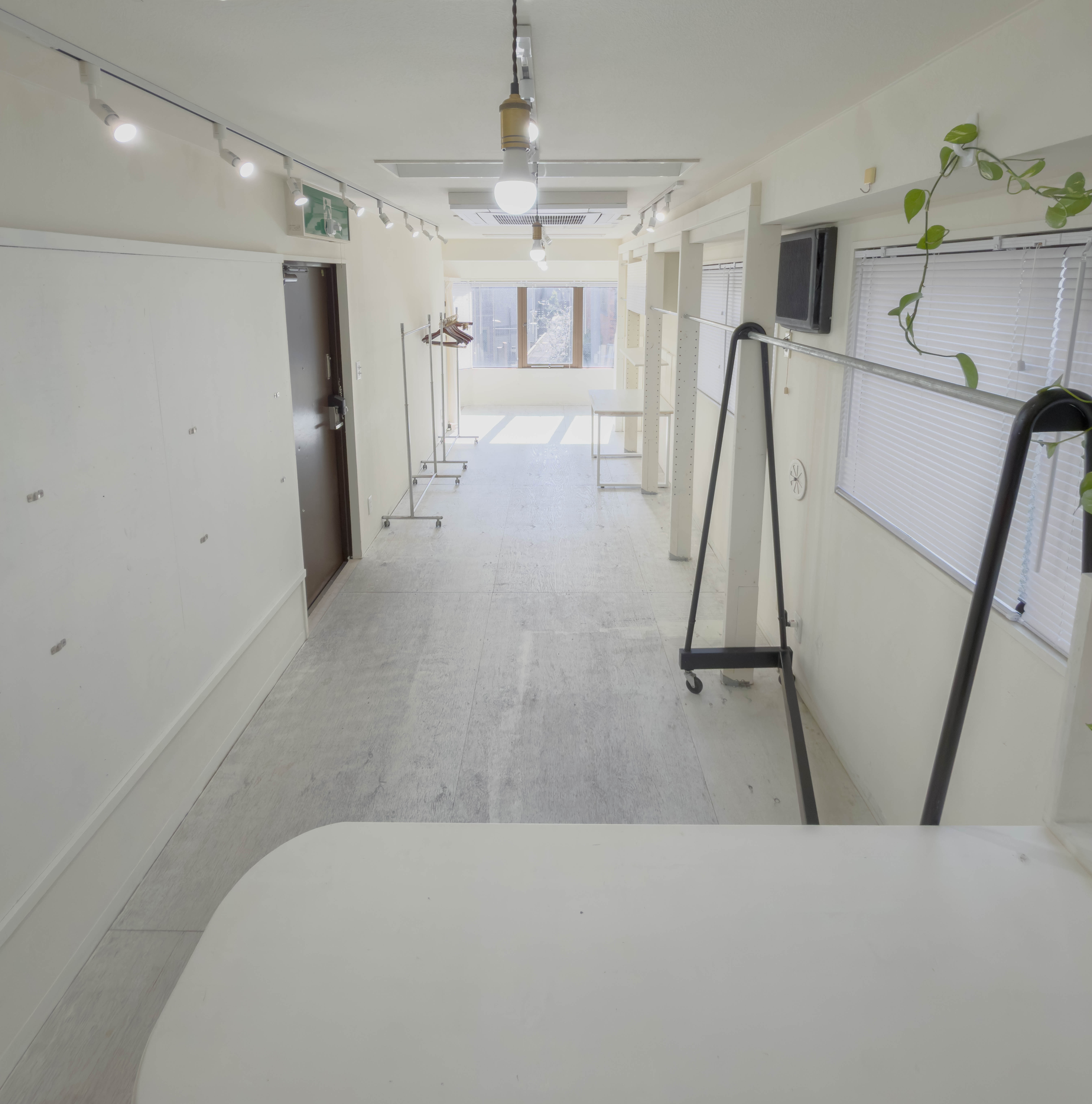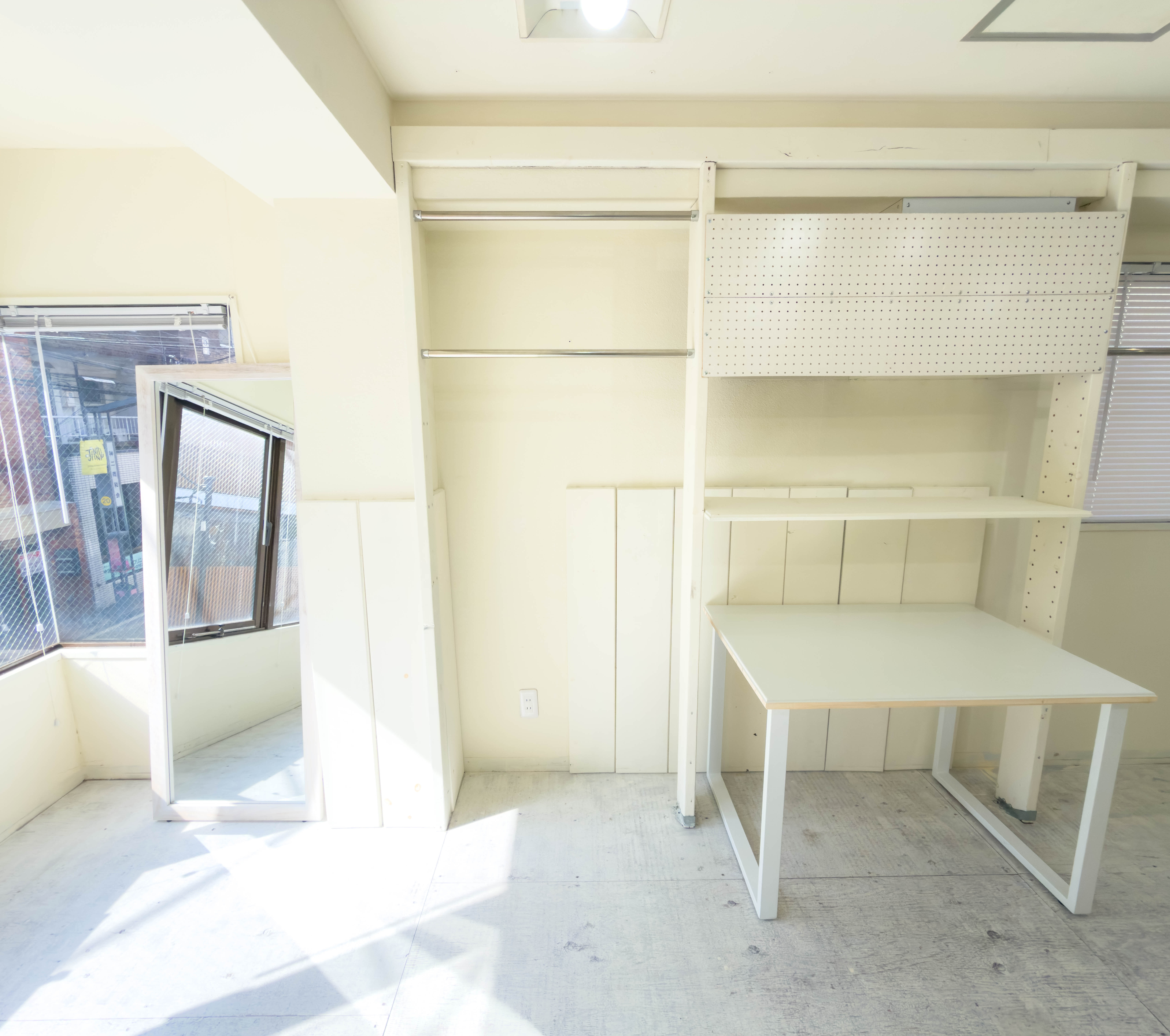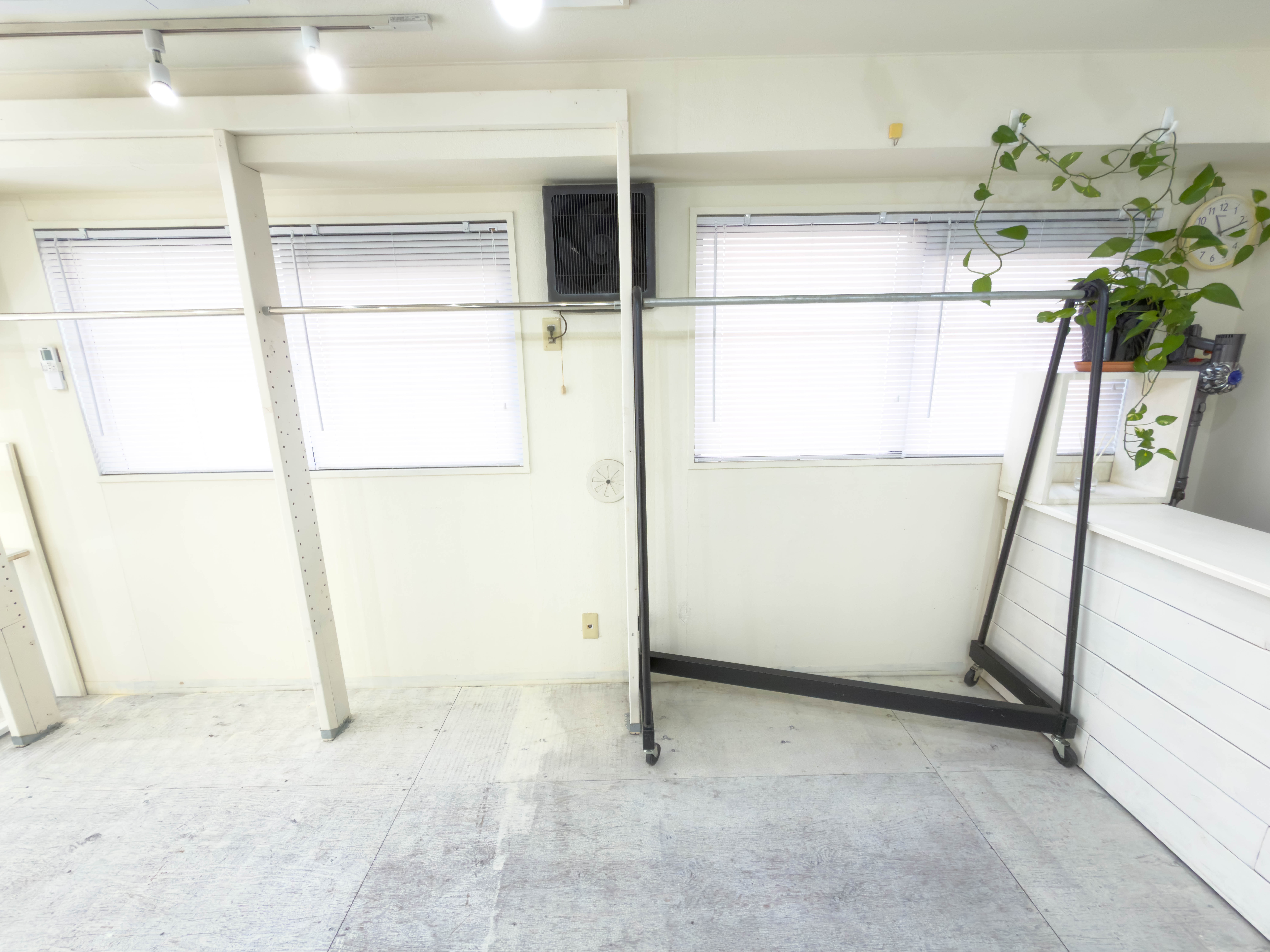 Z型ハンガーラック1台&備え付けハンガーラック2.5台に加え、通常のハンガーラック2台を用意。棚スペースや1000×700のテーブルも完備。