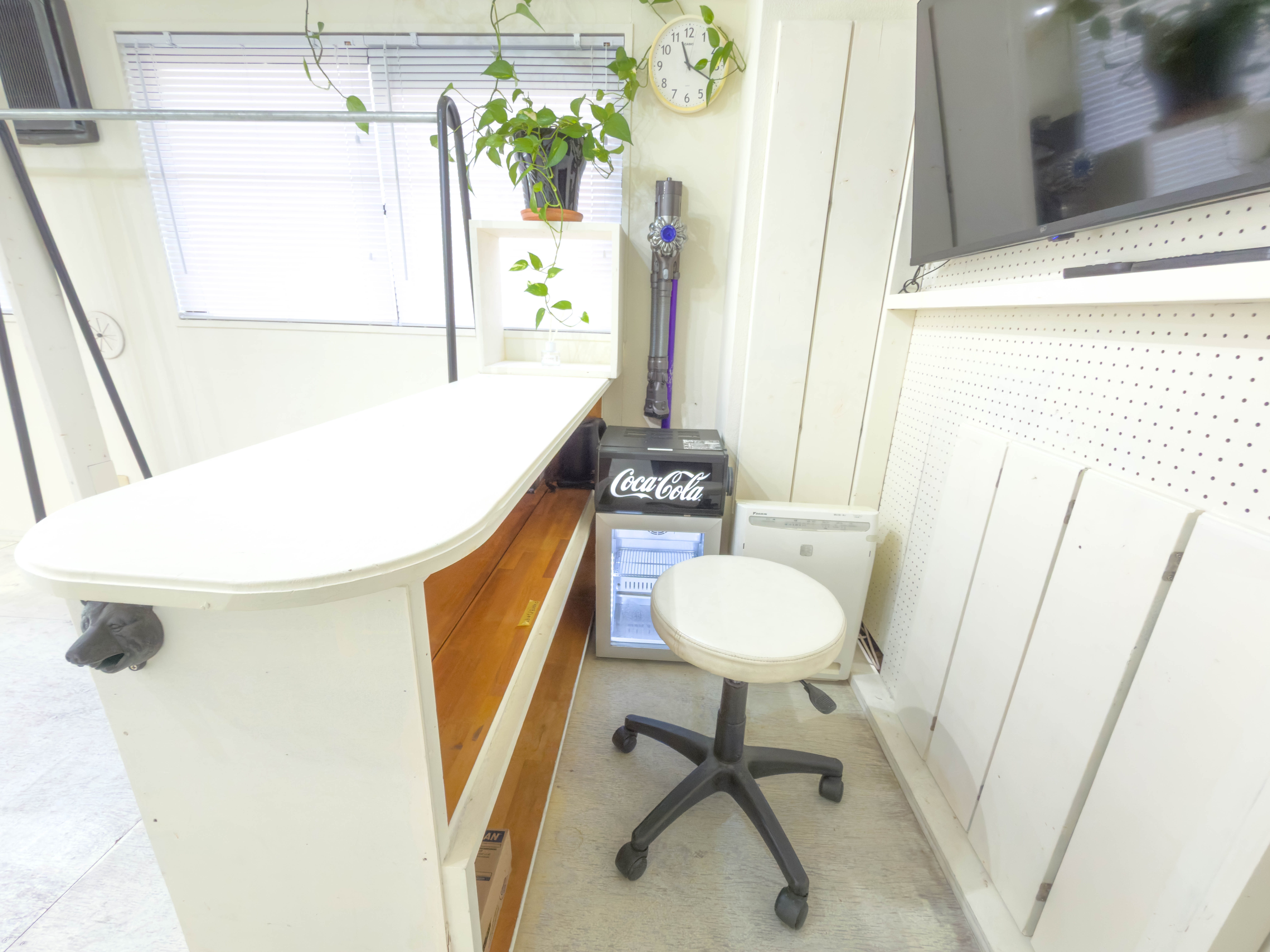 W1600×D450×H870mmのカウンター、空気清浄機、小型冷蔵庫を完備。長時間の展示会も快適に過ごせます。